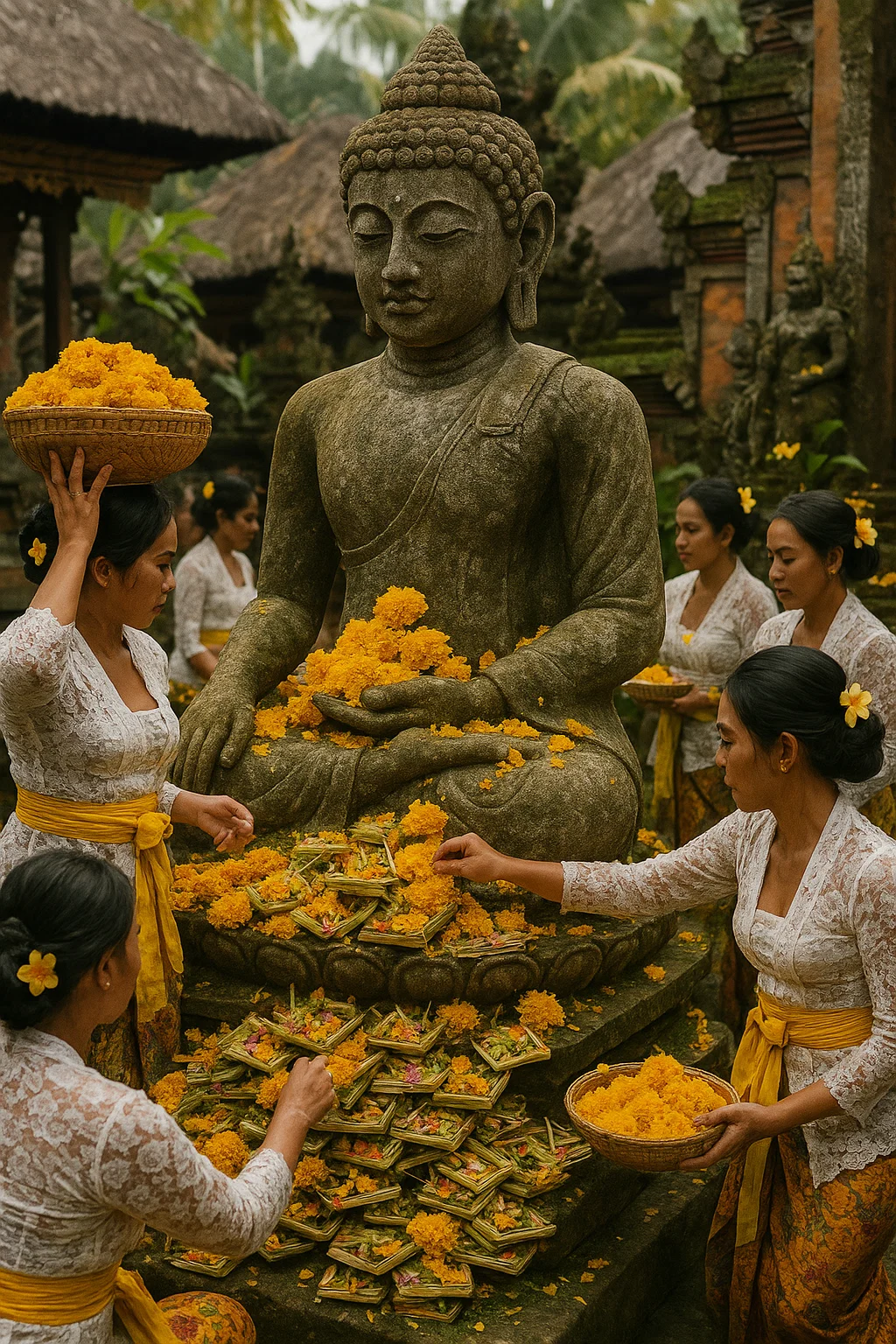 Ofreceri pentru abundanță: Balinezii creează ofrande speciale din flori, frunze de palmier, orez și monede, pe care le lasă în fața caselor sau în templele de familie.