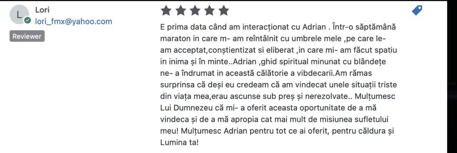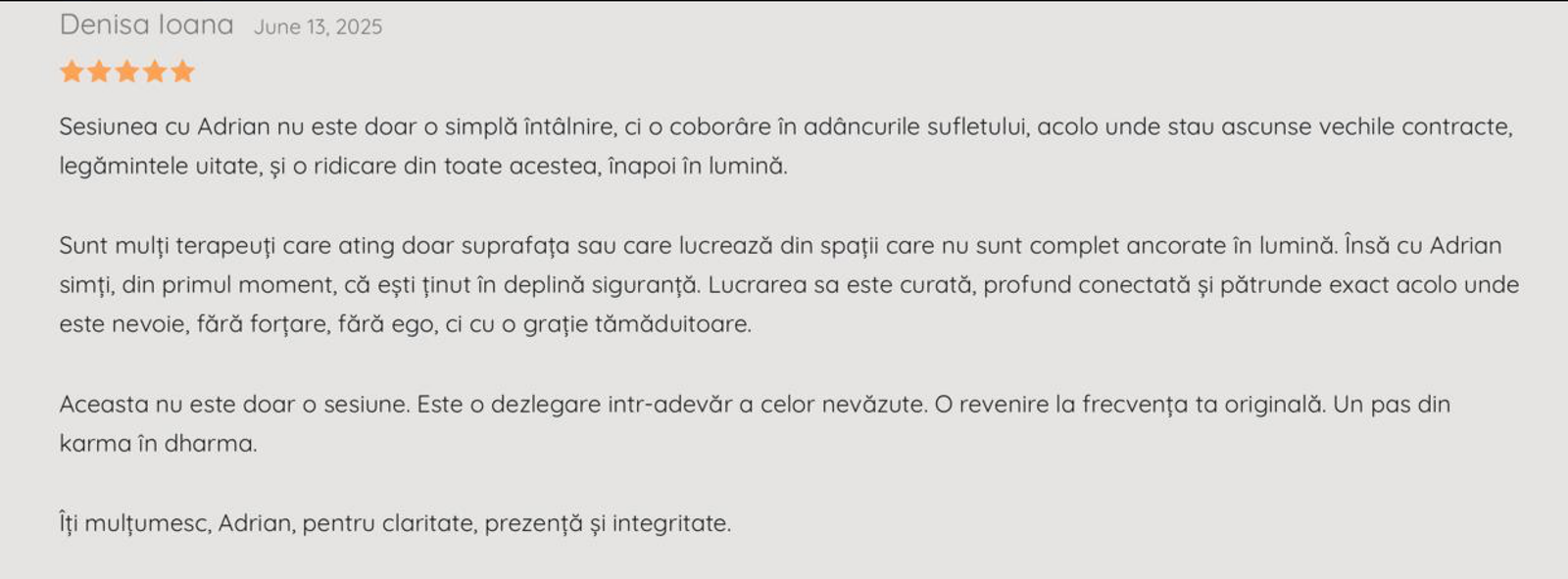 Cum dealtfel am simțit si am exprimat in simple două cuvinte la finalul sesiuni de lucru 1:1 cu Adrian, ,, Cuvintele sunt prea puține pentru a exprima ceea ce simți,, Eliberare odată pentru Totdeauna de acele incatusari, emoții profunde, acel corp durere care te tin prizonier in câmpul emoțional si energetic, pentru care Adrian oferă un spațiu Magic de ghidare și susținere energetică pentru Eiberare și Alchimie🙏💥