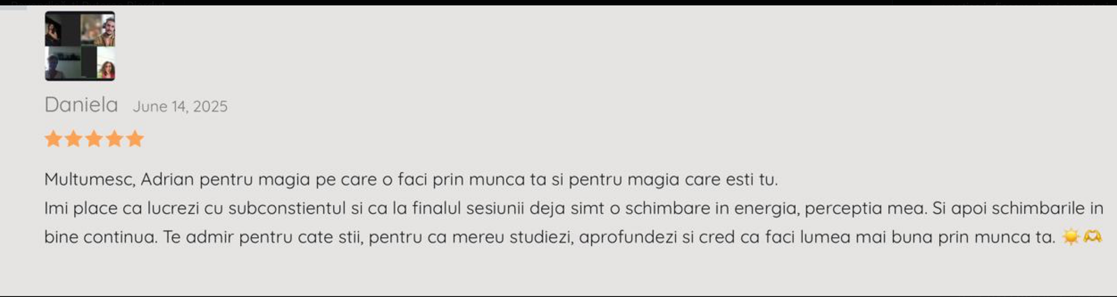 De fiecare dată primesc prin Adrian cunoștințe de Sine la un alt nivel. Nu prea pot pune in cuvinte ceea ce simt in corp, dar pot spune că am făcut cunoștință cu magiciana din mine🙏. Nu am recunoscut-o, nu am vrut să o văd pentru că am avut tot felul de blocaje dar prin practica adusă prin Adrian, am recunoscut-o instant. Am ieșit din practică toată un zâmbet, una cu magiaciana din mine.🤍