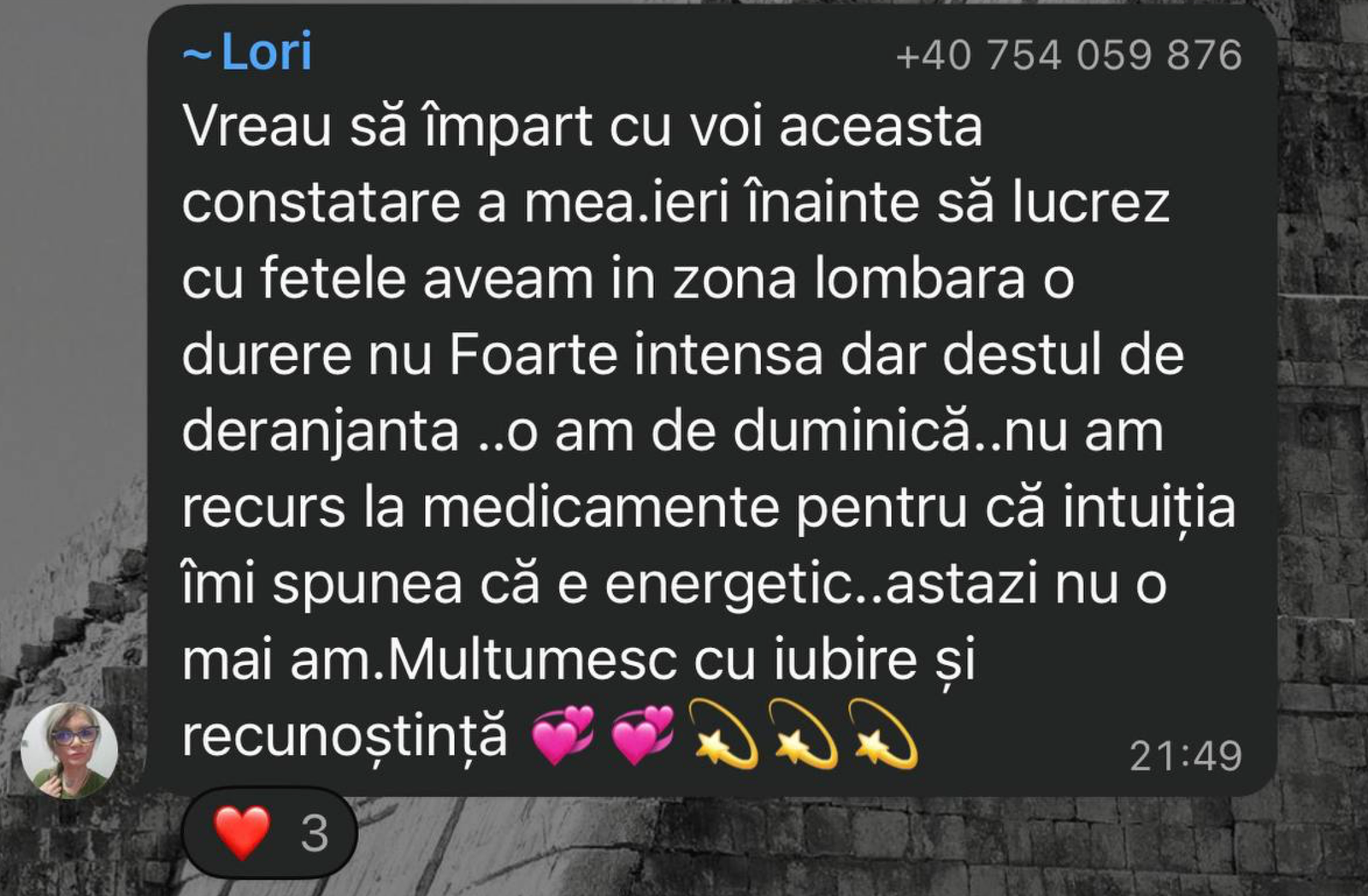 – la un moment dat simțeam că ceva mă perturbă destul de tare dpdv energetic (poate niște entități mai răuvoitoare sau altceva nu știu exact). Whatever that was am simțit că s-a disipat, a dispărut, m-a lăsat în pace și acum mă pot odihni liniștită și fără frică)