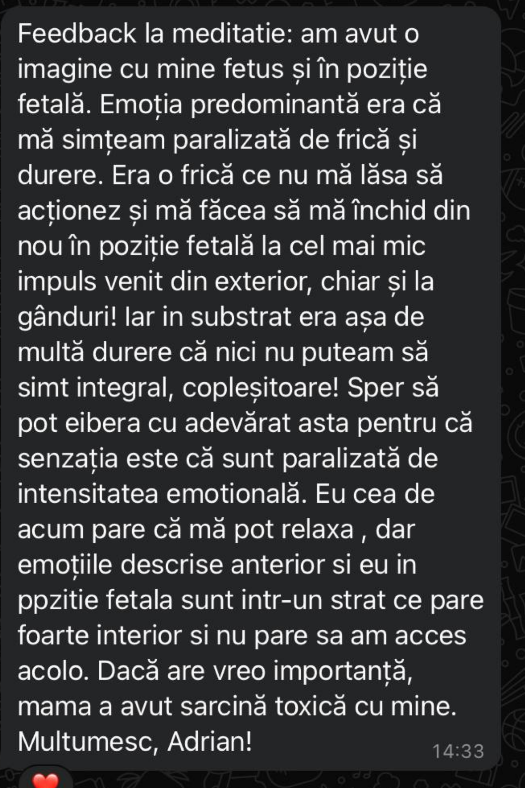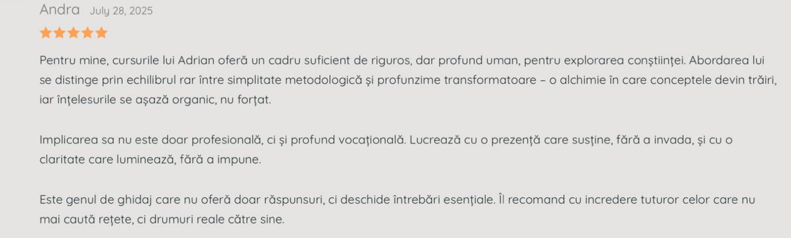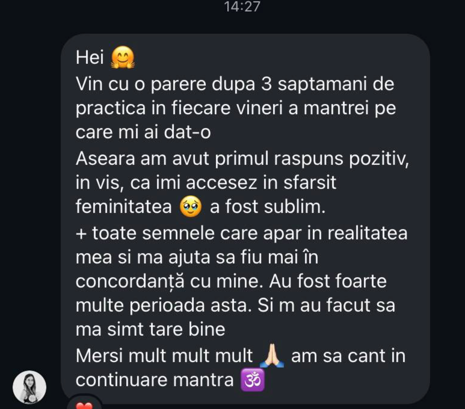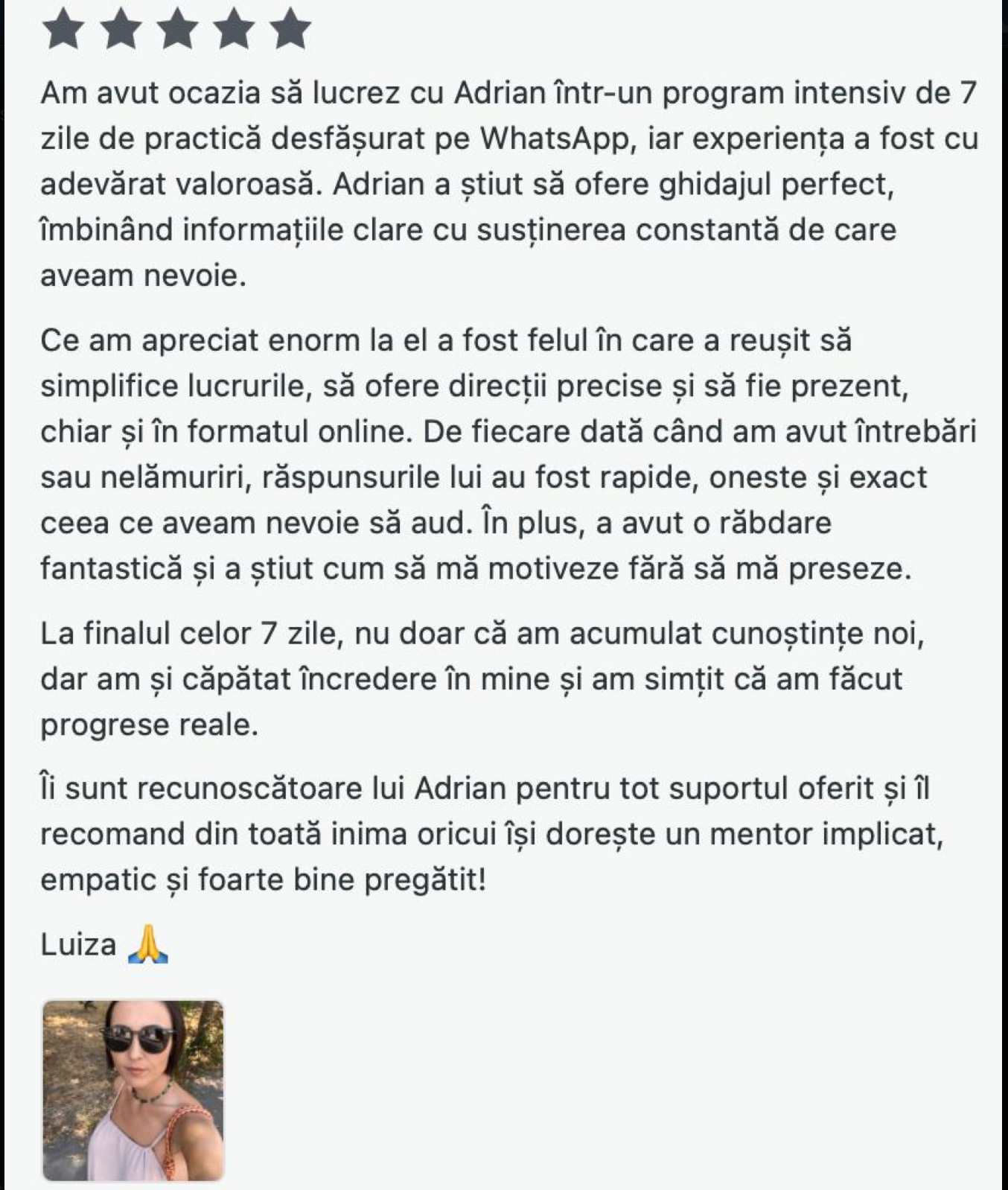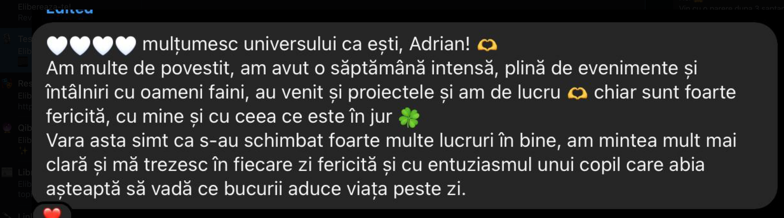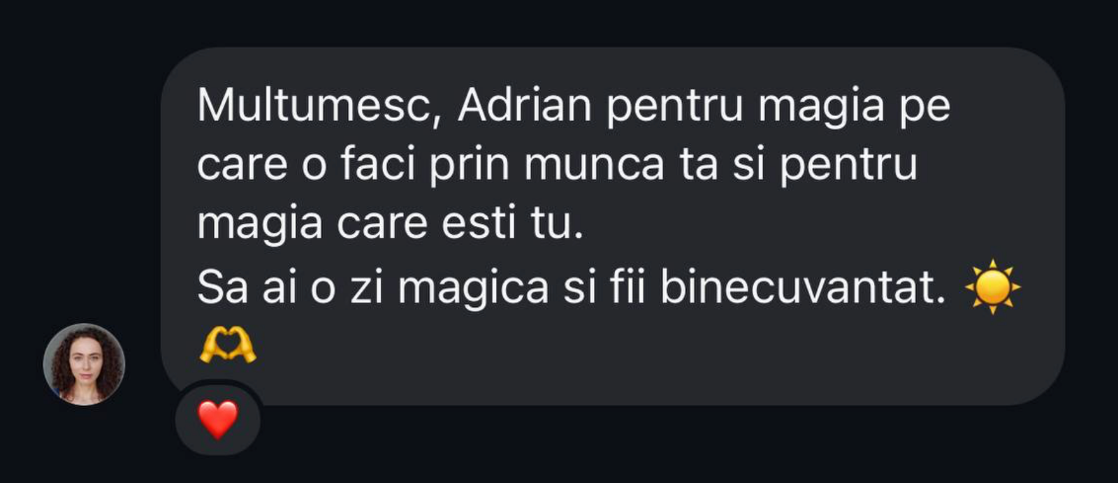 De fiecare dată primesc prin Adrian cunoștințe de Sine la un alt nivel. Nu prea pot pune in cuvinte ceea ce simt in corp, dar pot spune că am făcut cunoștință cu magiciana din mine🙏. Nu am recunoscut-o, nu am vrut să o văd pentru că am avut tot felul de blocaje dar prin practica adusă prin Adrian, am recunoscut-o instant. Am ieșit din practică toată un zâmbet, una cu magiaciana din mine.🤍
