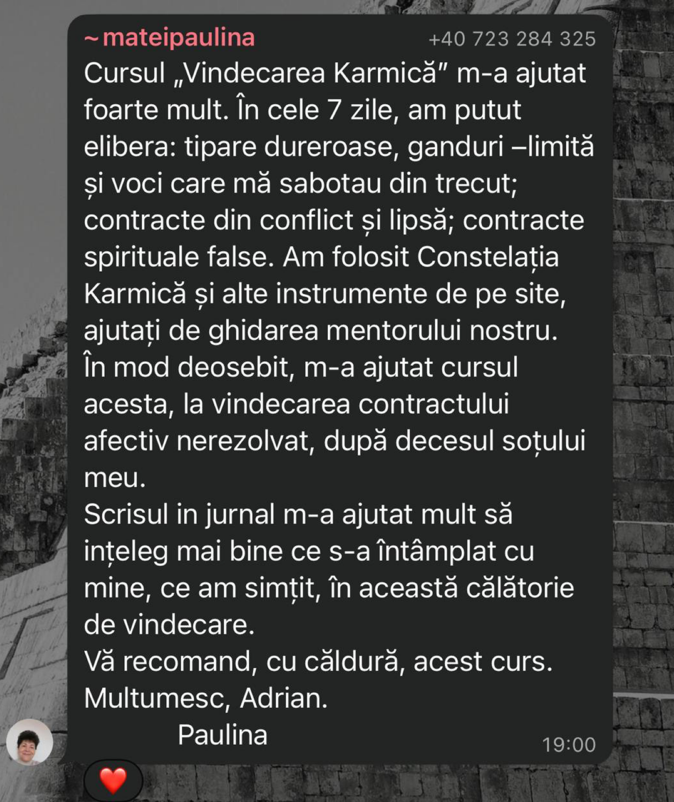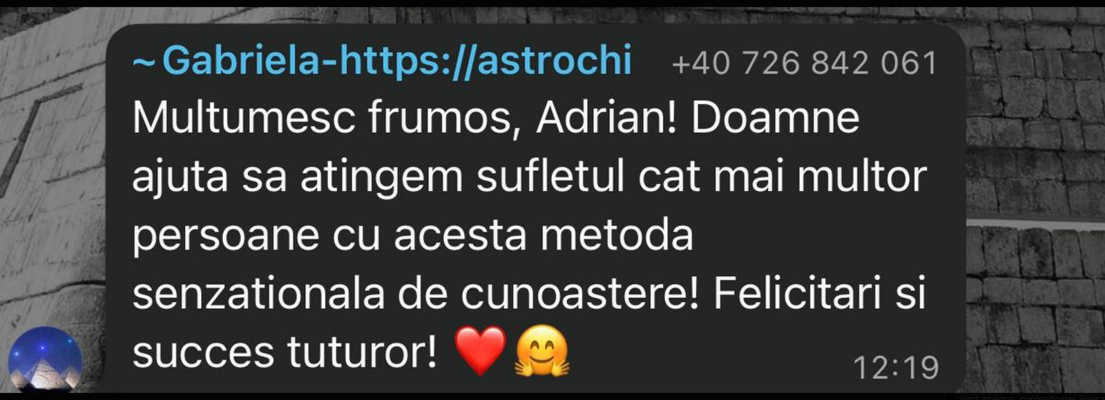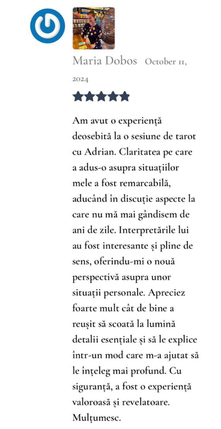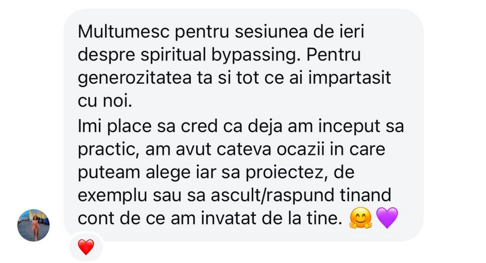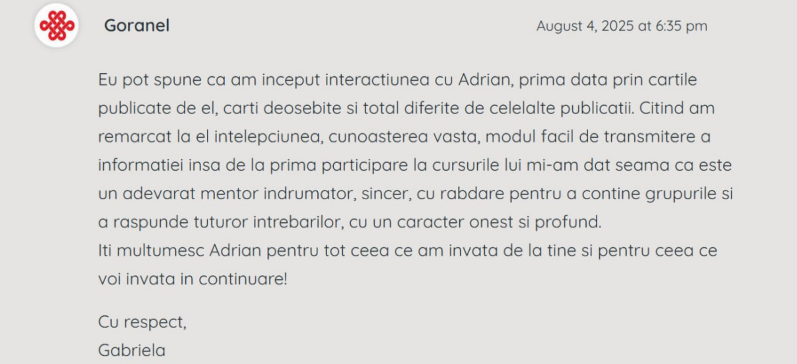 De fiecare dată primesc prin Adrian cunoștințe de Sine la un alt nivel. Nu prea pot pune in cuvinte ceea ce simt in corp, dar pot spune că am făcut cunoștință cu magiciana din mine🙏. Nu am recunoscut-o, nu am vrut să o văd pentru că am avut tot felul de blocaje dar prin practica adusă prin Adrian, am recunoscut-o instant. Am ieșit din practică toată un zâmbet, una cu magiaciana din mine.🤍