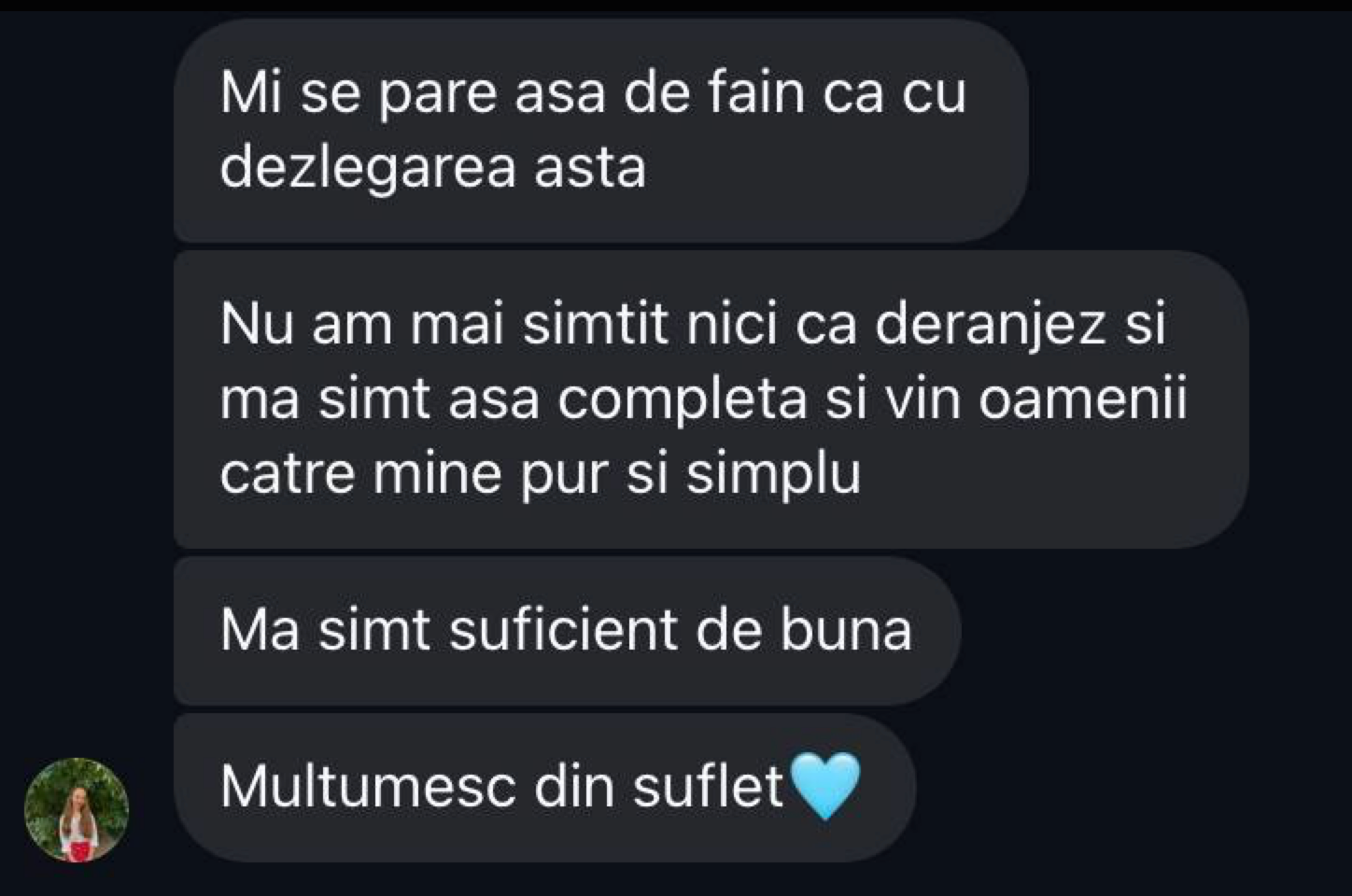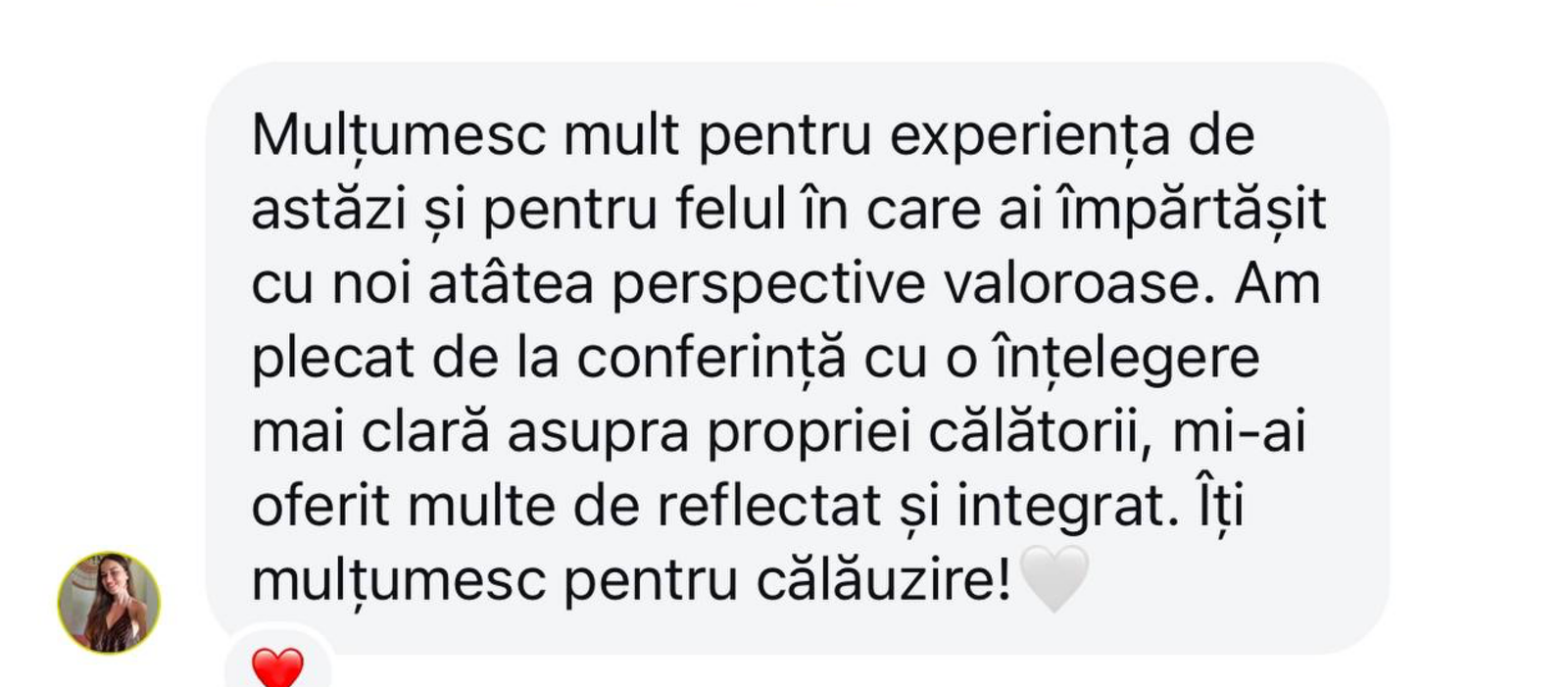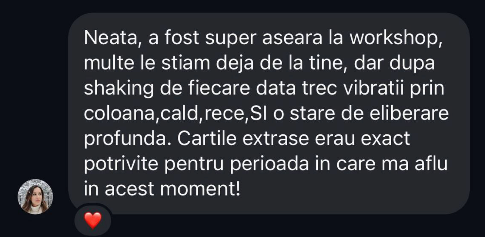 In urma work shopului Elibereaza-te, am experimentat bucurie, plans SI eliberari in zona stomacului SI umerilor, a fost intens,iar la final am simtit o usurare SI fericire. Multumesc, SI cu siguranta voi revenii cu drag!