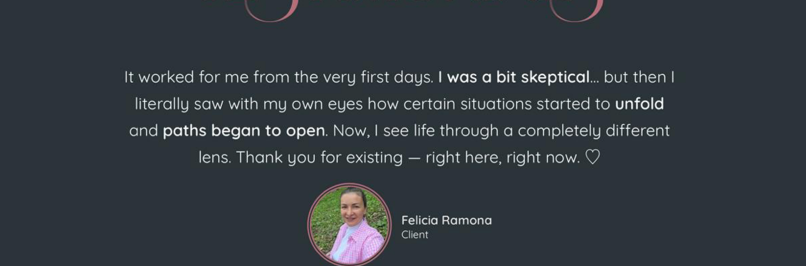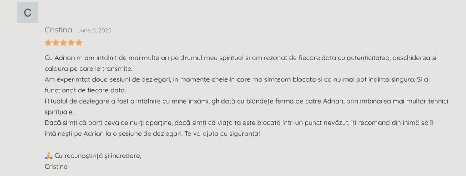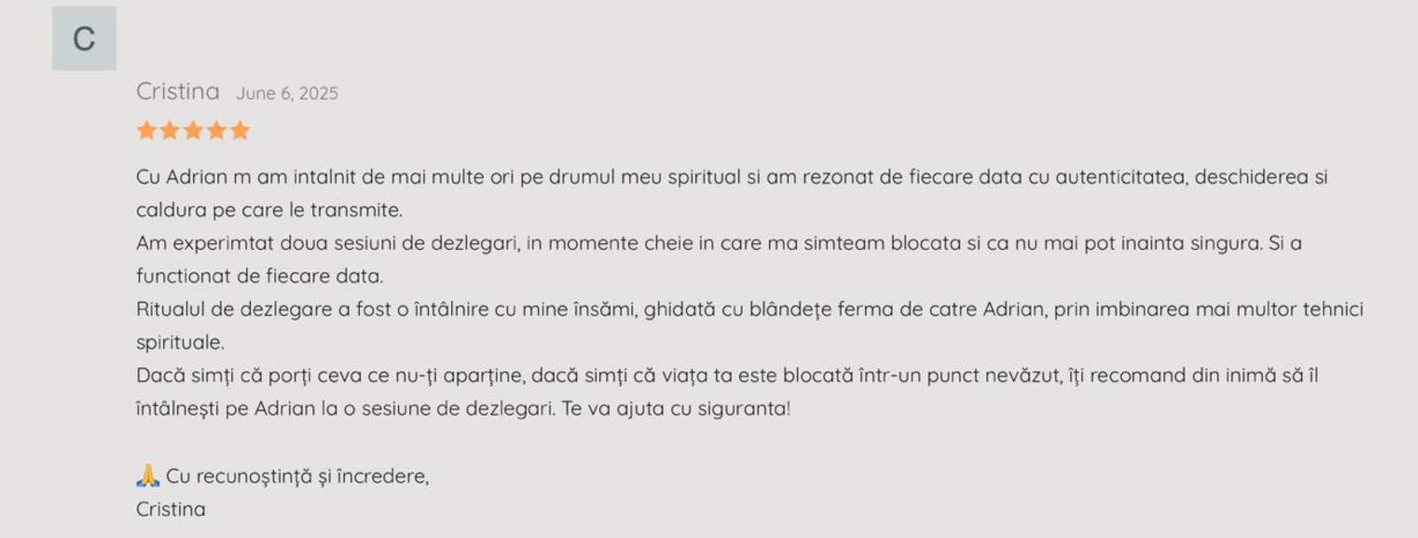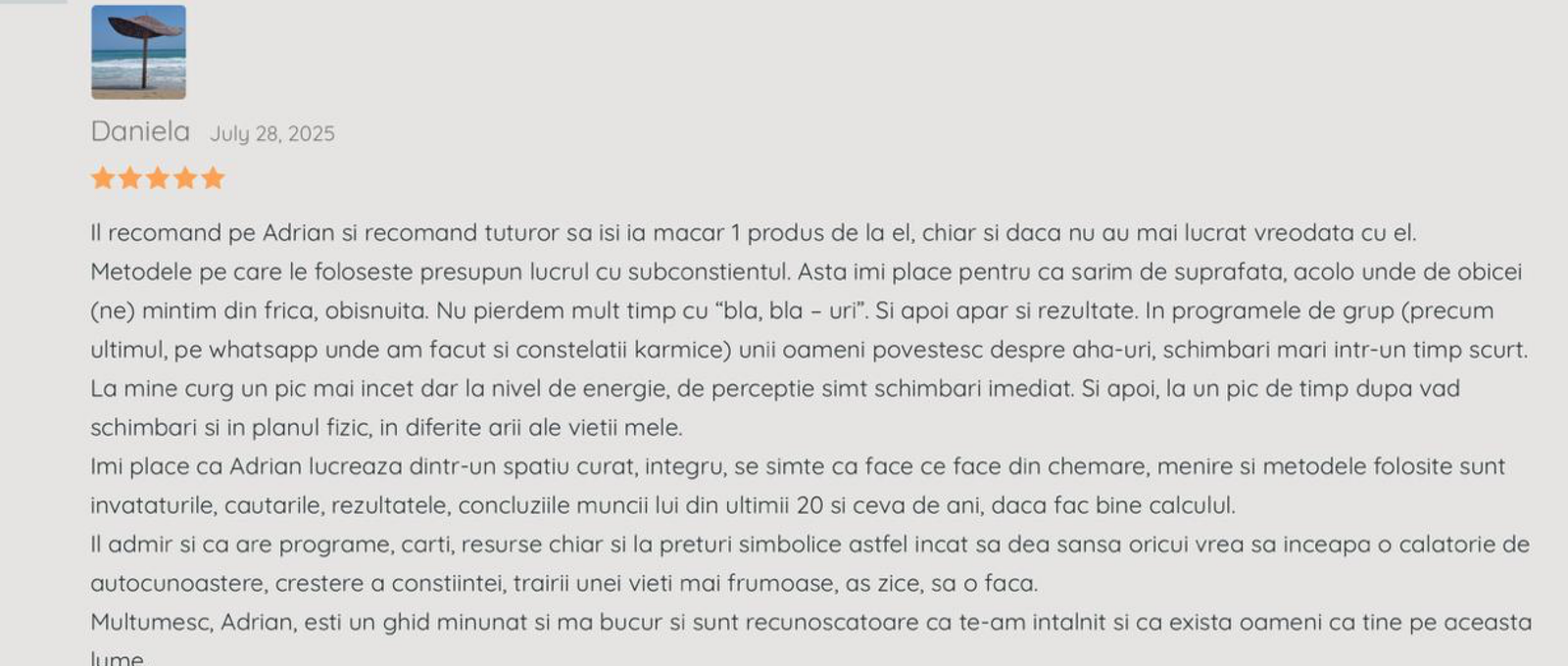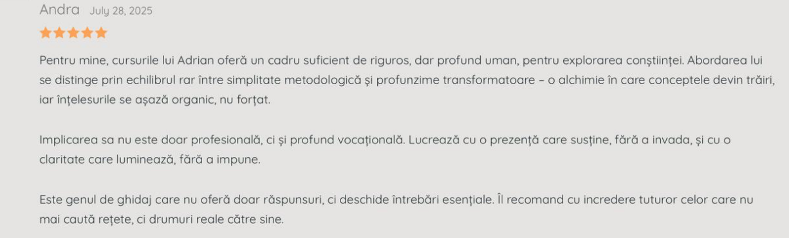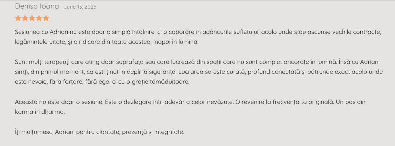 Cum dealtfel am simțit si am exprimat in simple două cuvinte la finalul sesiuni de lucru 1:1 cu Adrian, ,, Cuvintele sunt prea puține pentru a exprima ceea ce simți,, Eliberare odată pentru Totdeauna de acele incatusari, emoții profunde, acel corp durere care te tin prizonier in câmpul emoțional si energetic, pentru care Adrian oferă un spațiu Magic de ghidare și susținere energetică pentru Eiberare și Alchimie🙏💥